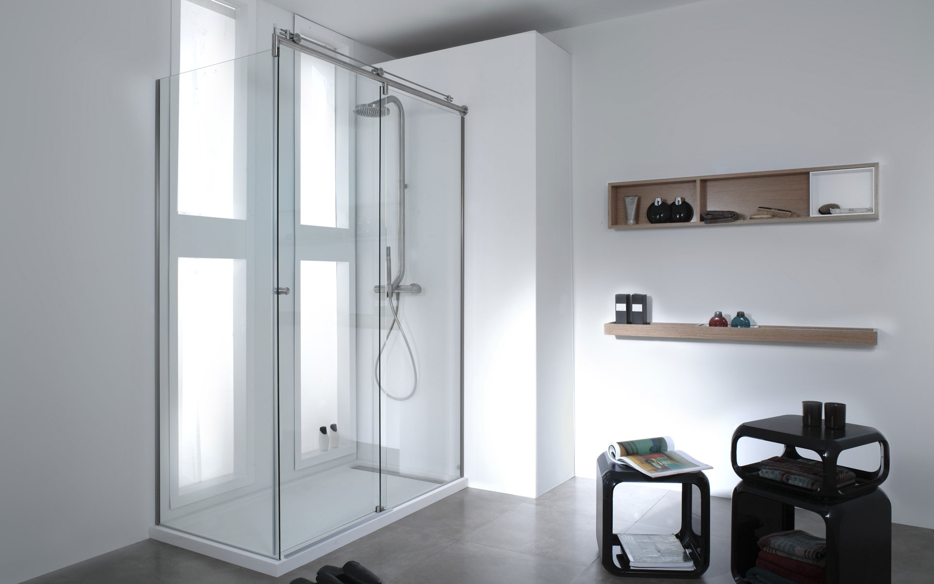 La paroi de douche ouverte pour les implantations à l’italienne, Porte coulissante en verre sécurit transparente, sérigraphiée où dépolie traitée antibactérien de 6 à 8 mm d’épaisseur avec profilés et poignée chromé et fixations murales par équerres